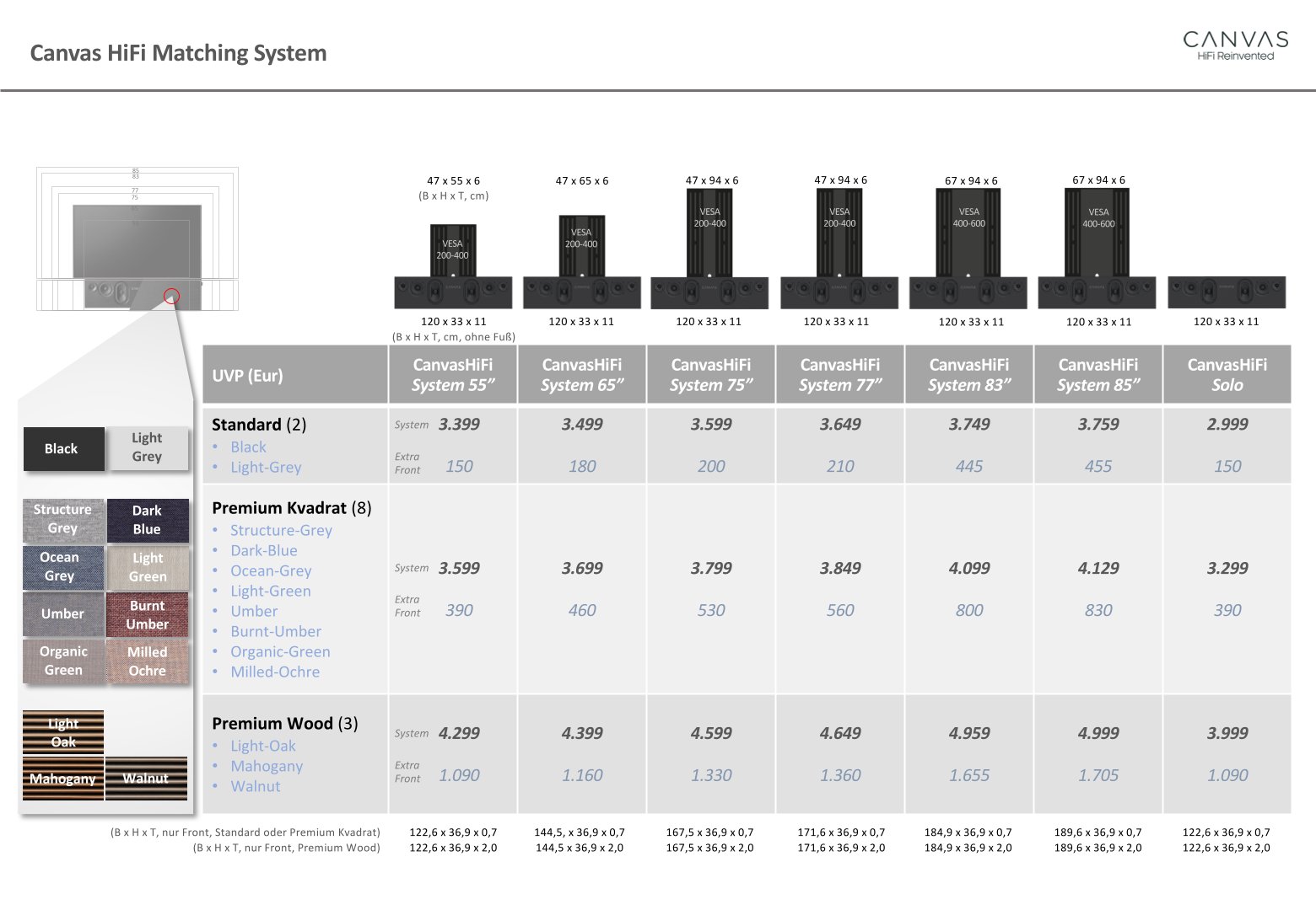 55″, 65″, 75″, 77″, 83″ und 85″. CANVAS bietet eine nahtlose und anspruchsvolle Integration mit Ihrem Fernseher. Erhöhen Sie Ihr Home Entertainment mit CANVAS auf ein neues Niveau.